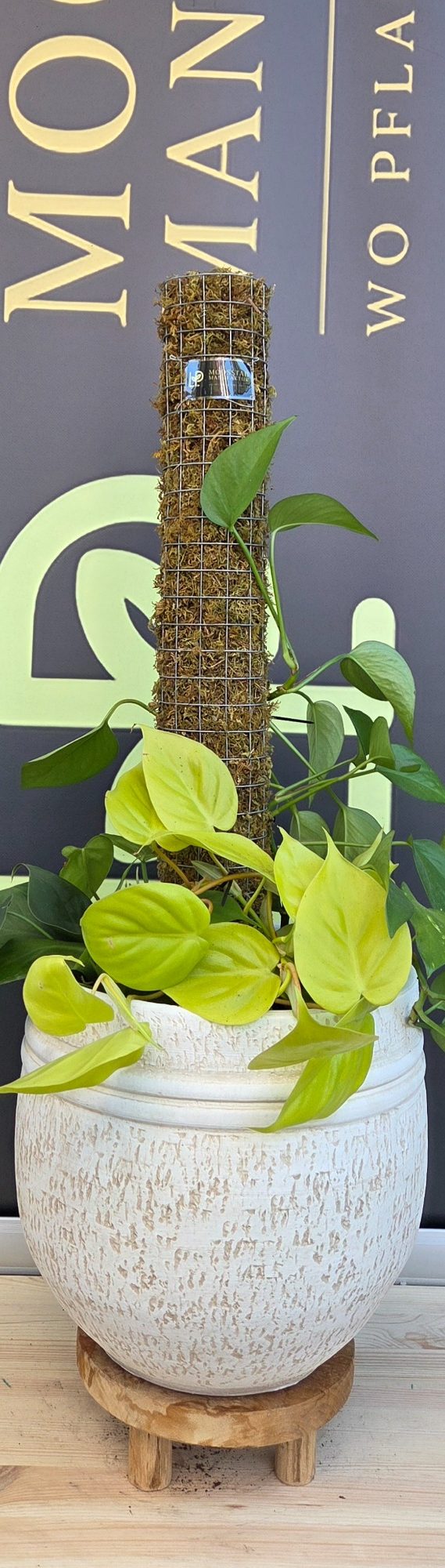 Kletternde Pflanzen wie Monstera, Philodendron oder Epipremnum bilden Luftwurzeln, die in der Natur an feuchten Baumstämmen haften. Die Moosstäbe der Moosstab Manufaktur ahmen genau diese Bedingungen nach: